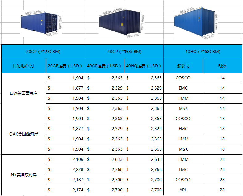 3、整柜訂艙需要提前3個工作日通知。 4、該報價到美國倉庫,包含卸貨費(fèi)用,不包含艙內(nèi)處理費(fèi)以及出貨費(fèi)用。